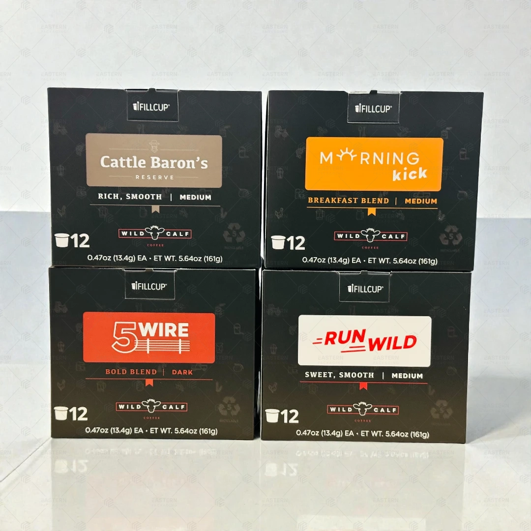 Material selection directly impacts box durability, print quality, and food safety, making it one of the most important aspects of K-cup packaging. The right material ensures that the box can withstand handling, stacking, and transportation without losing its shape or strength. It also plays a key role in how clearly colors, text, and branding elements appear on the surface, which directly affects shelf appeal and brand perception. In addition, food safety depends heavily on using materials that do not release odors, chemicals, or contaminants that could affect the product inside. Our custom K-cup boxes are manufactured using premium packaging stocks specifically selected for consumable products, ensuring they meet industry standards while maintaining consistent quality. These materials provide reliable protection, support high-resolution printing, and help preserve the freshness and integrity of K-cups throughout storage and distribution.
